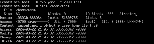 test 그룹의 gid를 변경한 뒤에 test 유저의 디렉토리가
