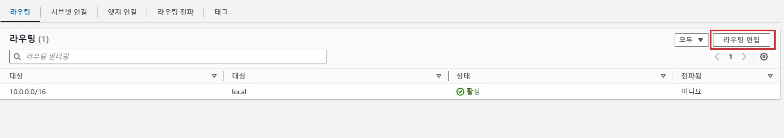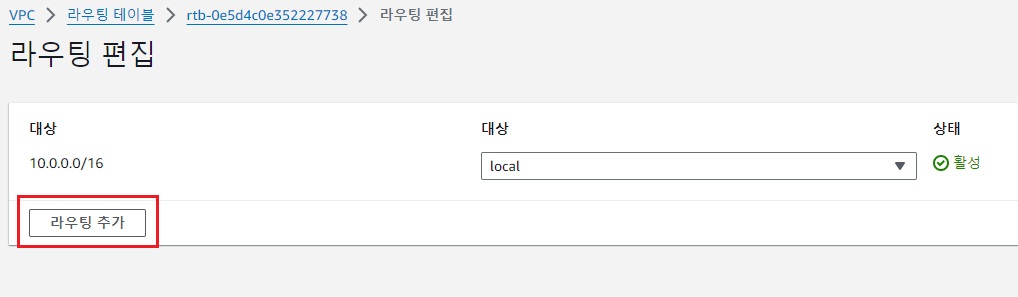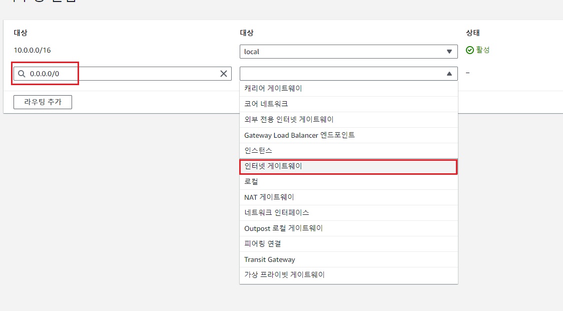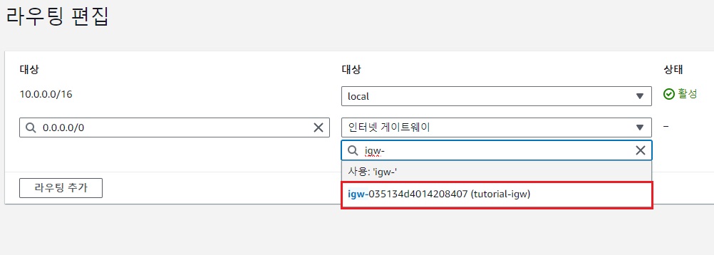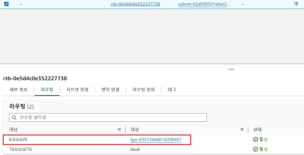 라우팅 테이블에 인터넷 게이트웨이로 가는 경로가 추가되었다.
