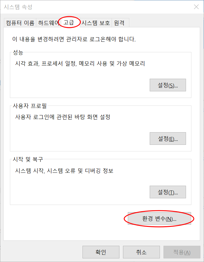 “고급” 탭의 “환경변수”를 클릭합니다.