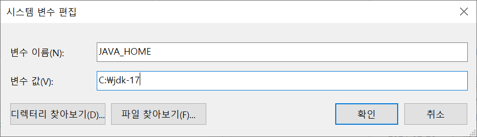 변수 이름에는 “JAVA_HOME”을 작성해 주고