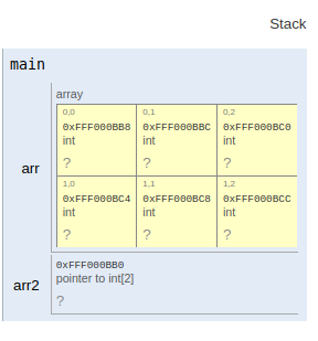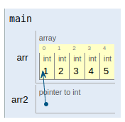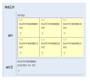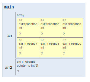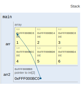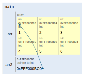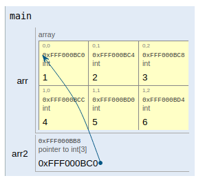 arr2는 arr[0][0]의 주소값을 가리키게 된다.