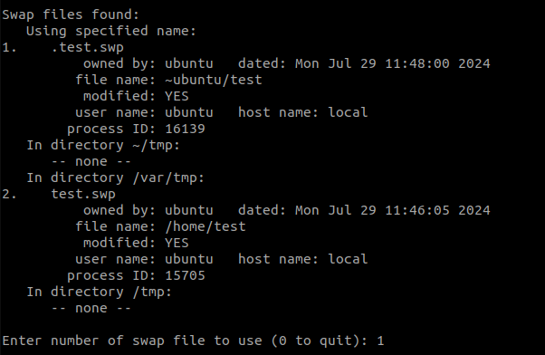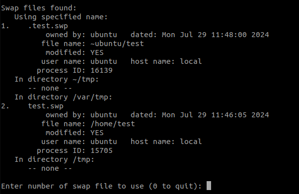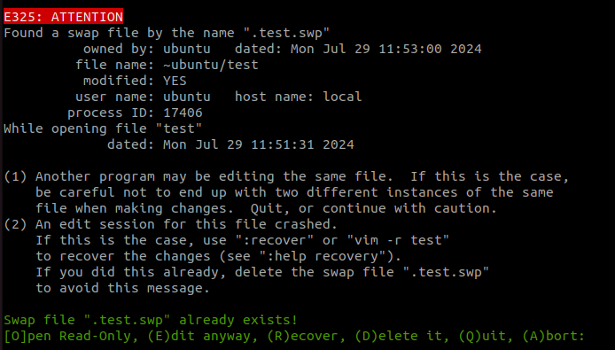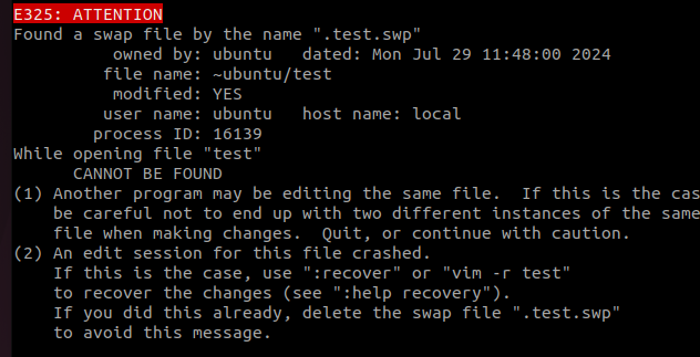 .test.swp 파일이 있다는 경고문이 보인다.