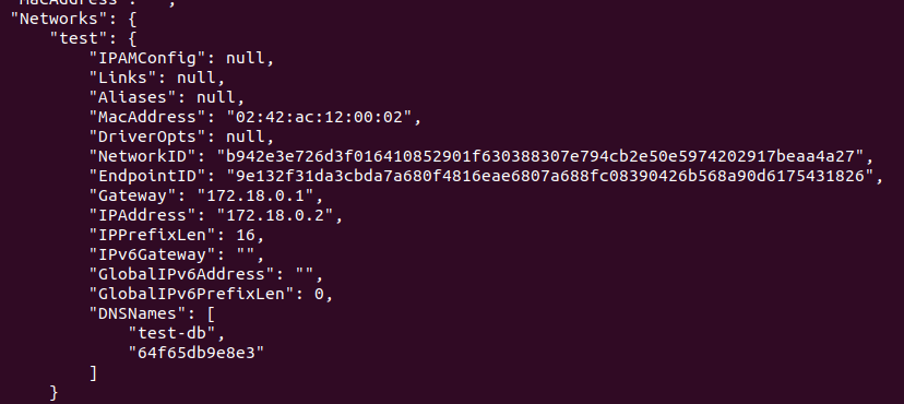 도커가 생성한 test 네트워크에서 실행 중인 test-db는