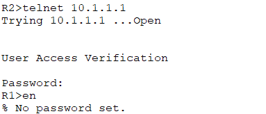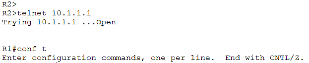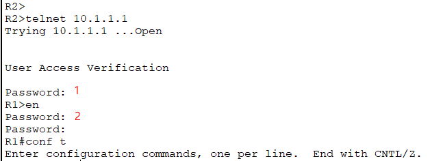 R2에서 telnet접속후 장치 접속을 위해서는 1111을
