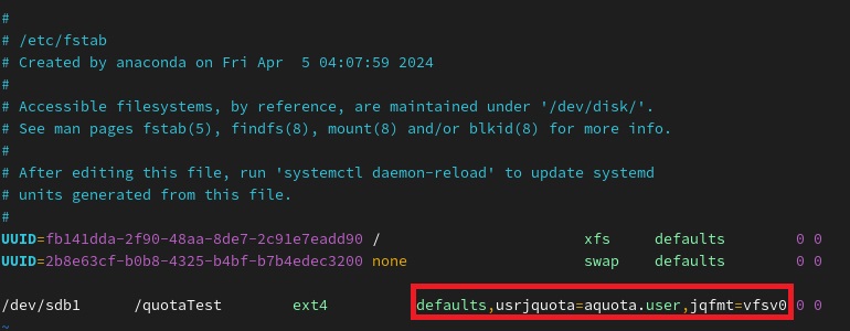 /etc/fstab 파일에 위와 같이 입력해준다.