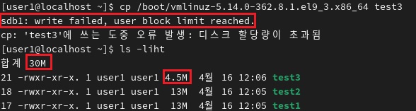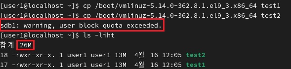 위의 파일을 /quotaTest/user1 디렉토리로 복사하여