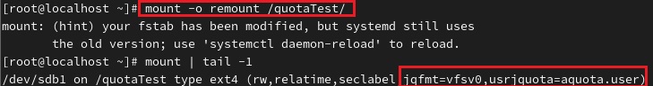 mount 의 remount 옵션을 사용해서 리마운트를 해주면 정상적으로 적용이 된것을 확인할수 있다.