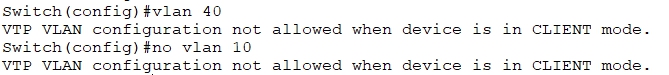 vtp mode가 client인 S2 에서는 vlan의 삭제, 혹은 추가가 불가하다.