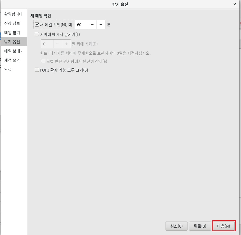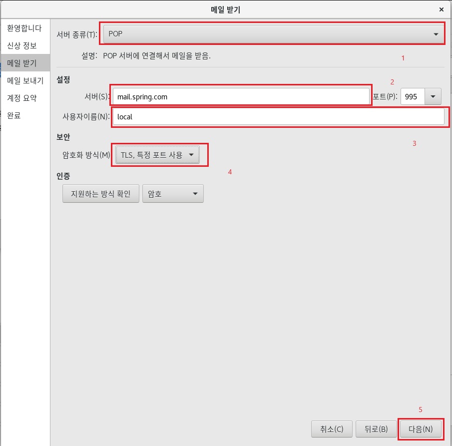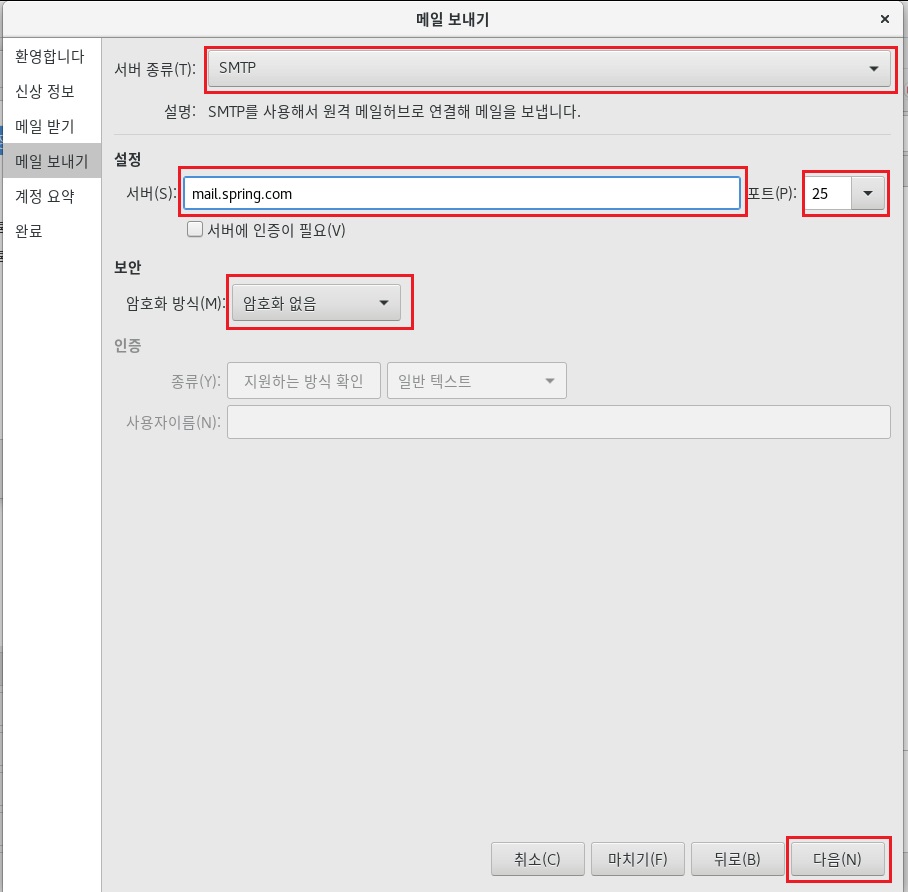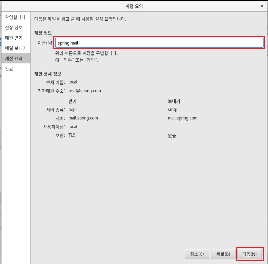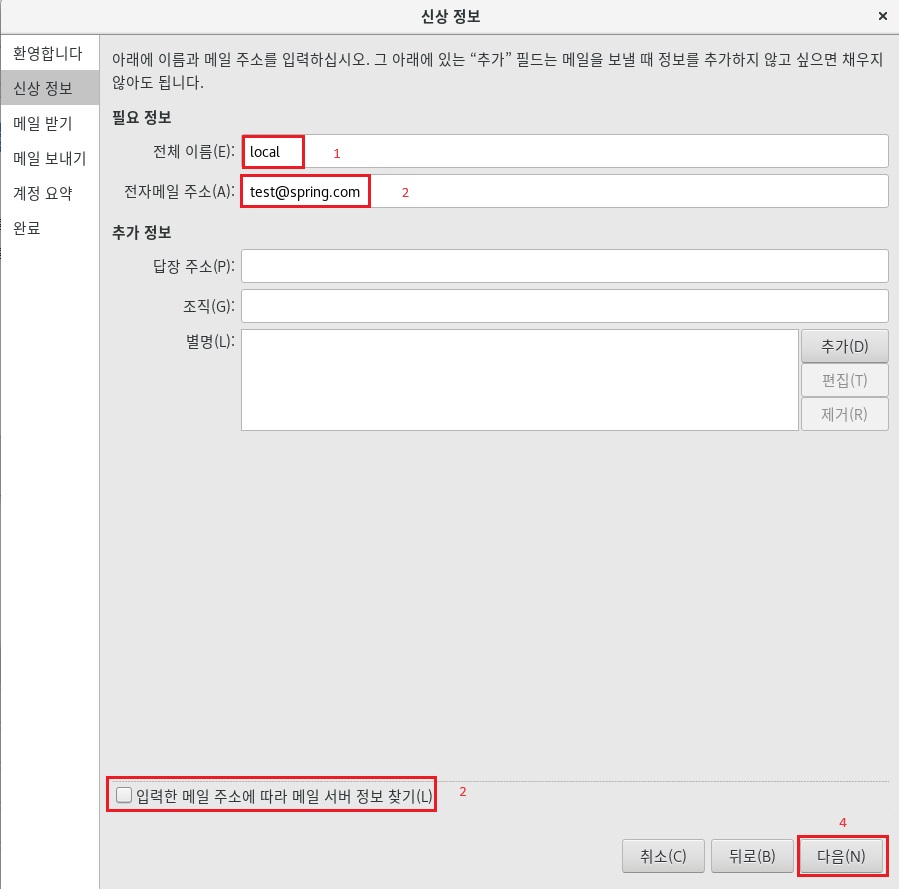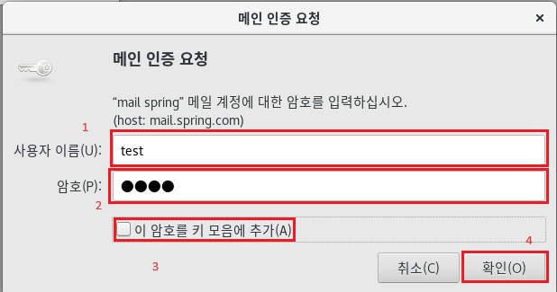 메일서버에서 추가한 계정으 정보를 입력