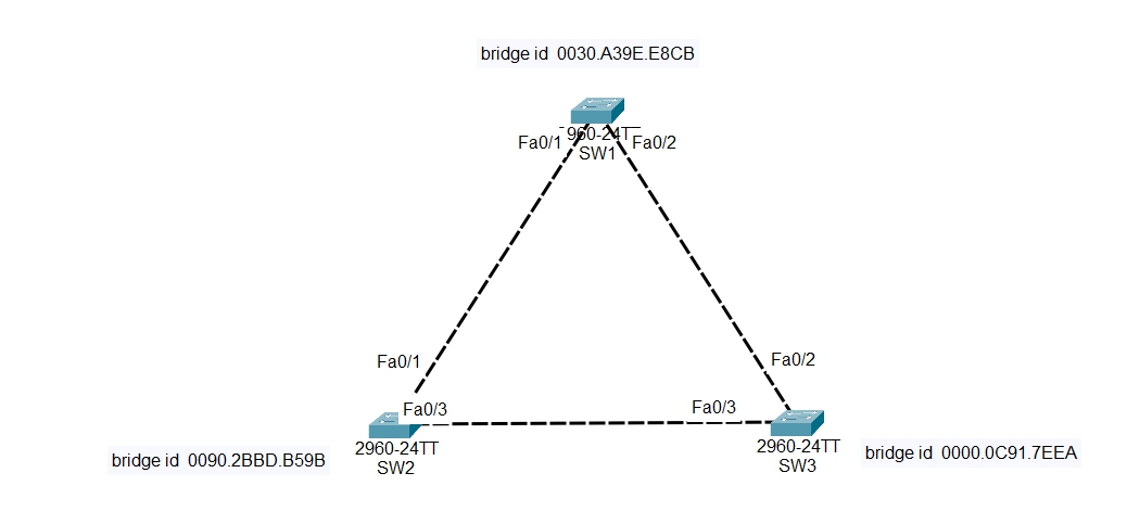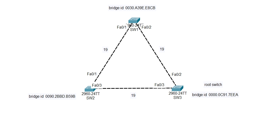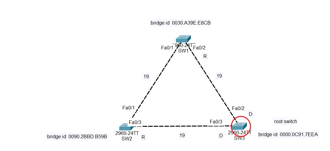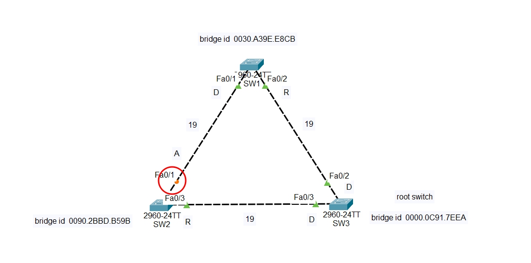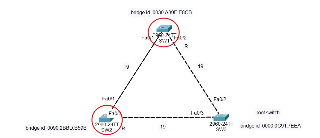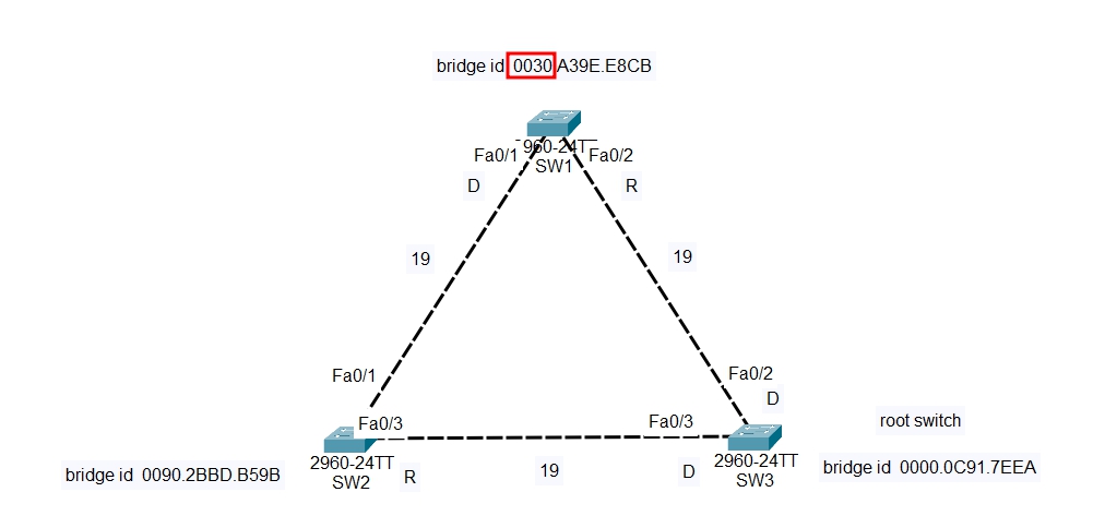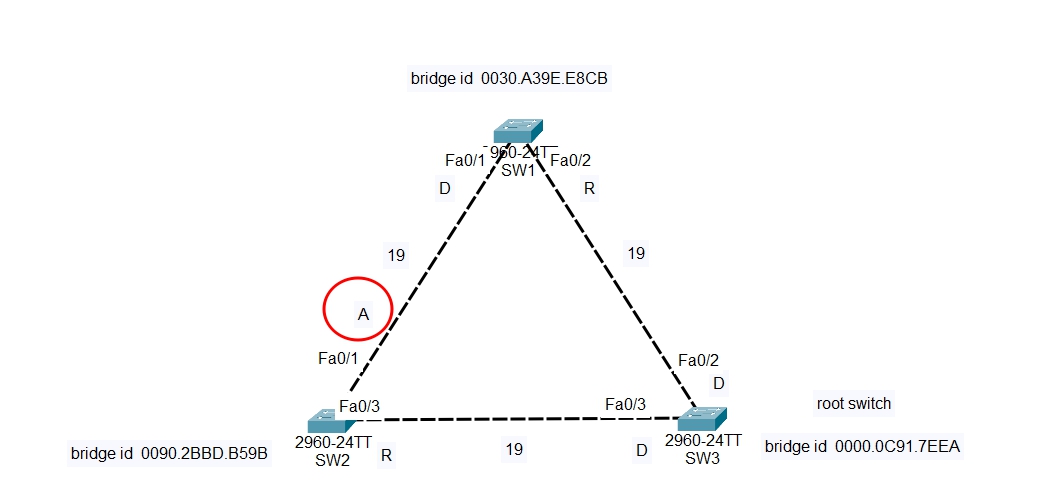 SW1과 SW2는 root swtich 까지의 거리가 같다.